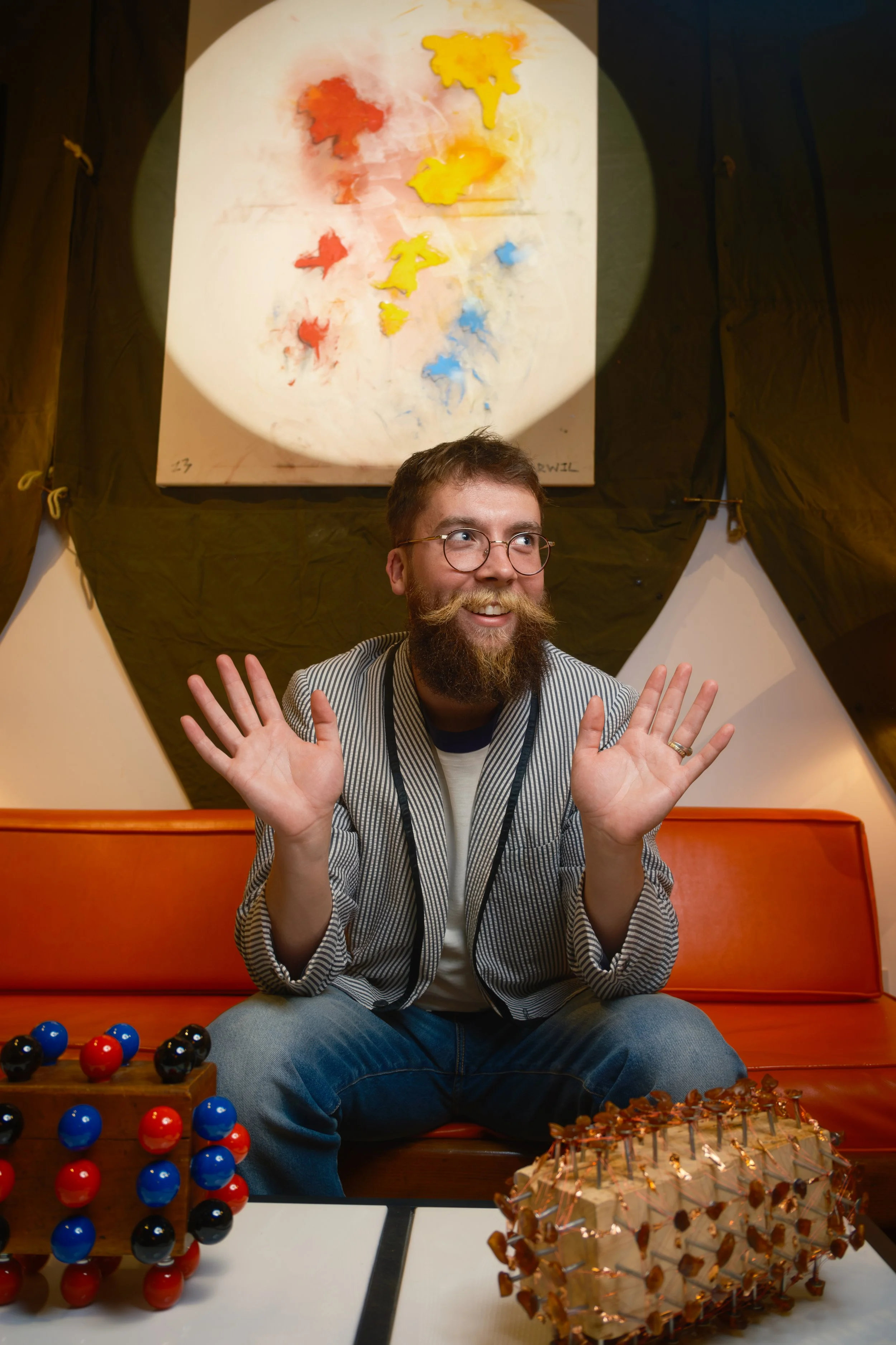 Wilson is a 26 year old multimedia artist based in Madison, originally from Benton, Arkansas. His work centers on the use (and misuse) of art materials to highlight the low-quality garbage that defines modern consumer culture. Wilson advocates for consumption habits that support skilled craftspeople, and rejects the mass-production of digestible corporate home decor.